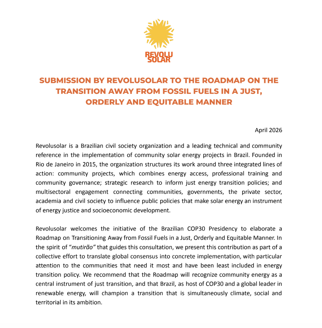 This document, the result of extensive collaborative work involving impacted communities, experts, researchers, and civil society organizations, brings together technical, legal, and institutional recommendations to qualify the expansion of large-scale centralized photovoltaic solar energy in Brazil, ensuring that the energy transition is, in fact, fair, sustainable, and centered on the territories. English and Spanish versions are also available for download.